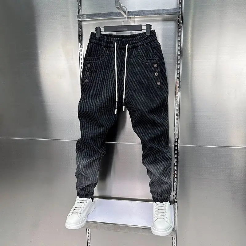 black patterned joggers, textured slim fit pants, snap button joggers, ribbed streetwear pants, SAINTEND black joggers, tapered slim joggers men women